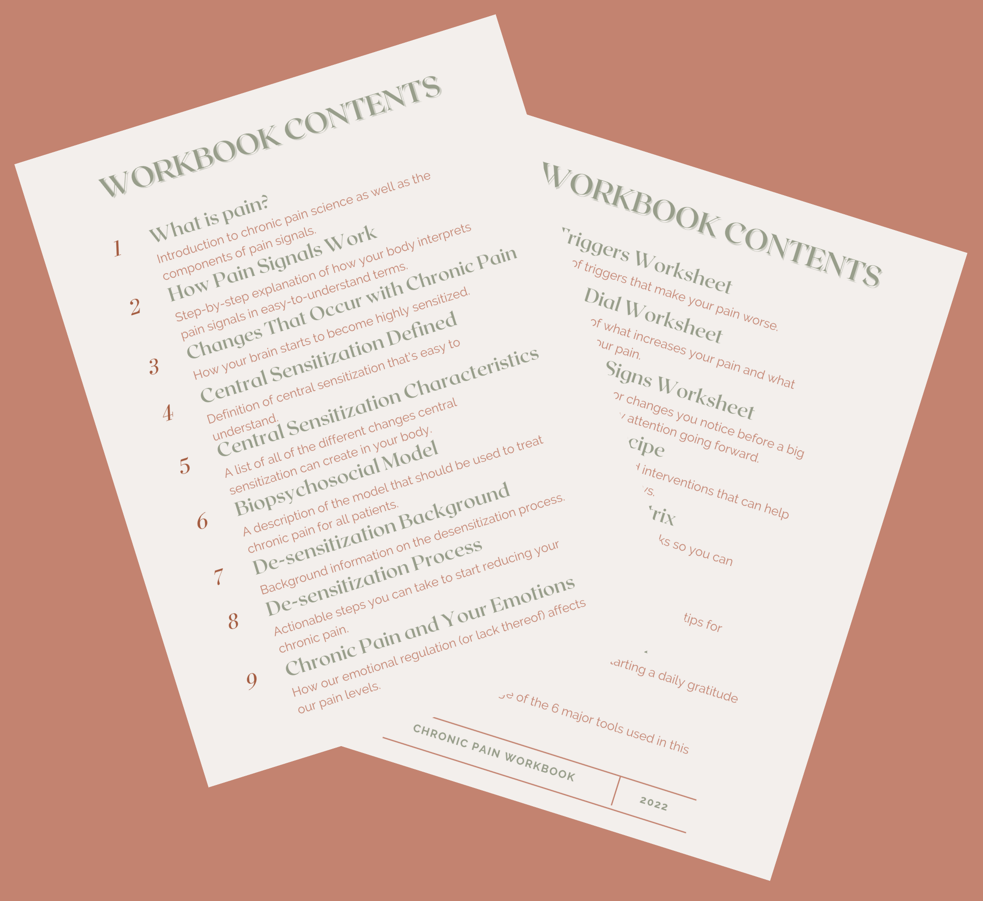 THEN THIS WORKBOOK IS FOR YOU!! The workbook will teach you how the nervous system detects pain in your body, how your nervous system changes in response to chronic pain, and which symptoms that can cause. It's all in terms that are easy to digest and understand - no science background required! After the teaching portion, the workbook equips you with worksheets, prompts, skills, and action items to help you take back some control in your life and begin to take tangible steps towards progress.